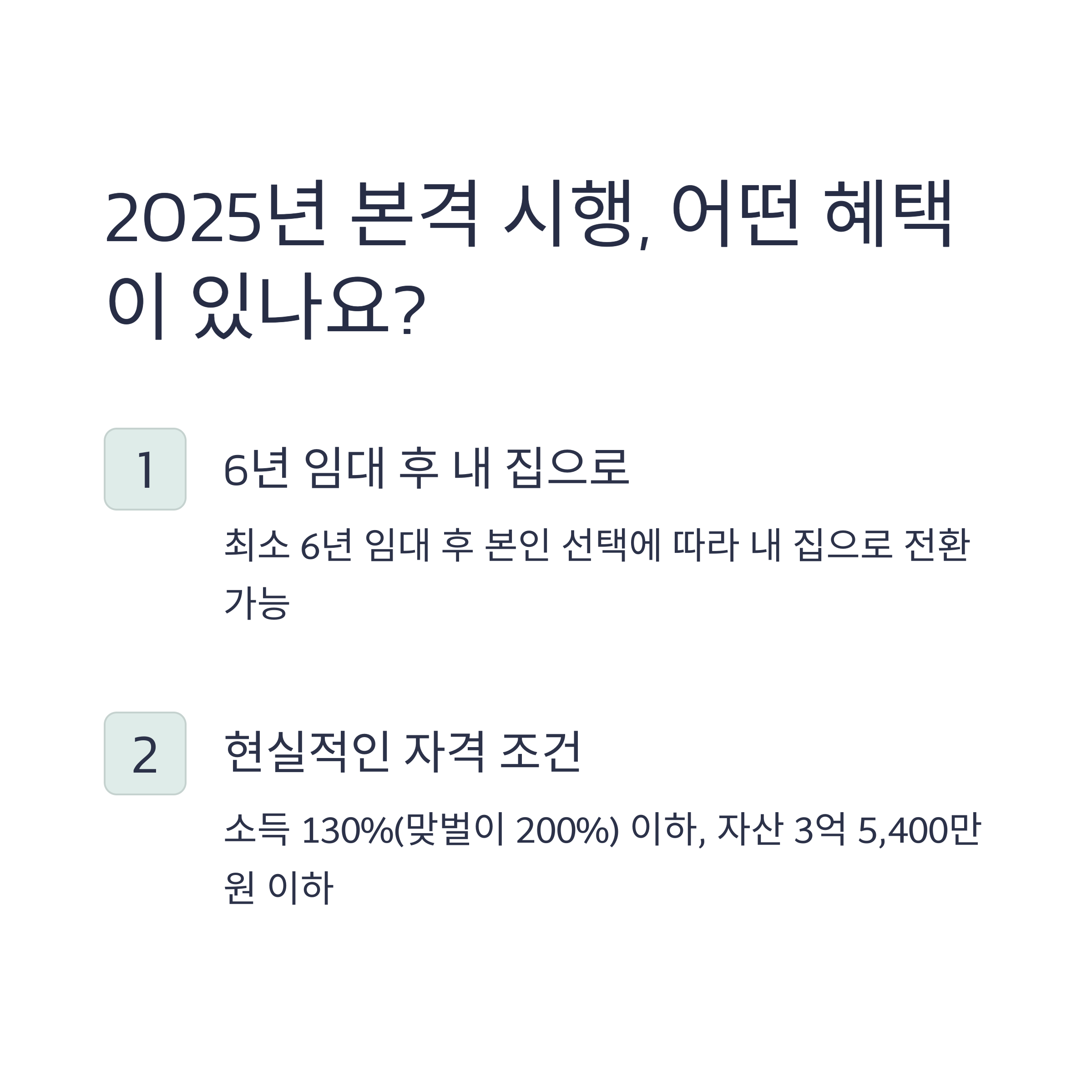 2025년 현재, 분양전환형 매입임대주택은 청약 경쟁에서 밀려나기 쉬운 서민, 청년, 신혼부부들에게 현실적인 내 집 마련의 기회를 제공하고 있습니다. 수도권을 중심으로 아파트, 중형 평형 등 실거주에 적합한 주택들이 공급되고 있으며, 전세 대비 저렴한 임대료, 청약통장 미사용, 분양가 안정 장치 등 여러 장점이 결합되어 있어 매우 주목할 만합니다. 임대 거주 중에도 자산을 쌓고, 향후 내 집을 가질 수 있다는 점에서 이 제도는 단순한 임대정책을 넘어 주거 사다리 역할을 하고 있습니다. 제도의 조건과 일정을 잘 파악하여 준비된 기회를 꼭 내 것으로 만들어보세요.